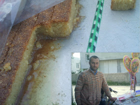 You can see in this photo that the Revani seems heavier, they have used more syrup the one above is a bit lighter.  This man was selling pieces of Revani off the back of his motor bike at the wedding I went to.