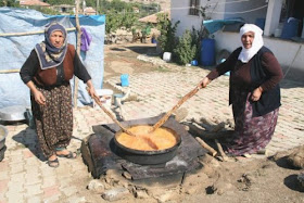When we lived in Adana one of the houses we lived in had a yard(garden, backyard) and it had a couple of mulberry trees one was white and the other was dark.  The white ones are good for eating raw and they are not too sweet.  I also discovered at the local bazaars that they sold the white mulberries dried! I dont know how they dry them as they are not sticky so they must do something to them.  I tried to dry some on my roof and it all became a sticky mess.  When we first came to Antep we went to the main park and I was interested to see men selling drinks on the street, after taking a closer look I realised it was mulberry juice they were selling and for only 50 kurus a cup.  Thick, sweet with a slight bite it was wonderful.  They say it is liquid penicillin, whenever I go to the city centre I make sure I buy a cup of mulberry juice.  I also discovered Pekmez  which is a thick syrup used in cooking or as a general tonic.  With the help of my family we harvested the black mulberry tree by everyone holding a sheet under the tree and my oldest son climbed the tree and shook the branches.  We then squeezed the mulberries through a cheesecloth to get the juice.  I then took the juice and boiled it until it became thick and syrupy.  Making it is very easy if you have a supply of fruit.  Pekmez is a syrup so stays fresh in the cupboard without further processing.
